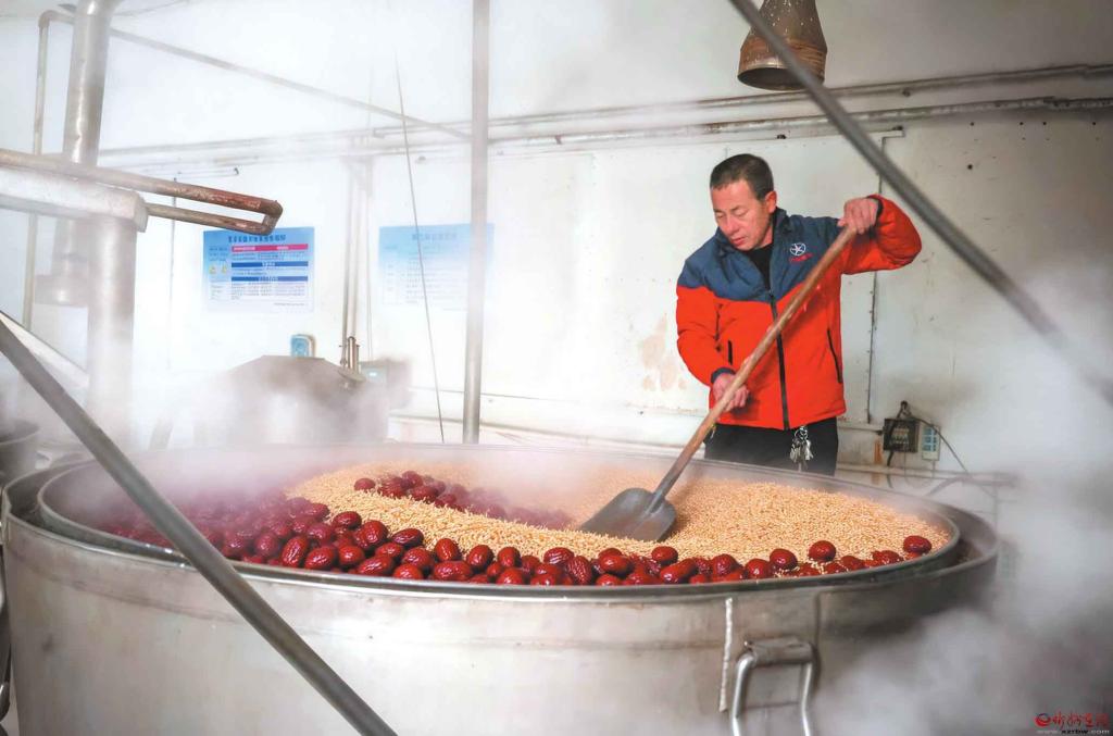 近年來,保德縣貢棗酒開發(fā)基地以“保德油棗”與枸杞入酒,不僅更好地保留了果實的溫補特性,也釀出了獨特的地方風(fēng)味。該基地不僅是當(dāng)?shù)赝苿蛹t棗產(chǎn)業(yè)深加工、提升附加值的關(guān)鍵項目,也是將地理標志農(nóng)產(chǎn)品轉(zhuǎn)化為特色商品、助力鄉(xiāng)村振興的生動實踐。圖為保德縣貢棗酒基地,工人在蒸餾車間翻動攪拌麥殼與紅棗等原料,車間內(nèi)蒸汽彌漫。(記者 范琛攝)