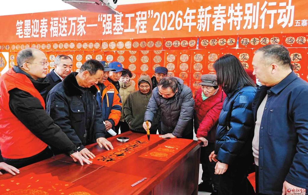 新春將至,年味漸濃。近日,由五寨縣文聯(lián)聯(lián)合縣總工會(huì)、團(tuán)縣委舉辦的“筆墨迎春福送萬(wàn)家”送春聯(lián)活動(dòng)走進(jìn)李家坪鄉(xiāng)李家坪、張家坪村,以筆墨為媒傳遞新春祝福,用文化服務(wù)筑牢基層精神根基,讓“強(qiáng)基工程”的溫暖觸角延伸至鄉(xiāng)村一線。(劉篤效攝)