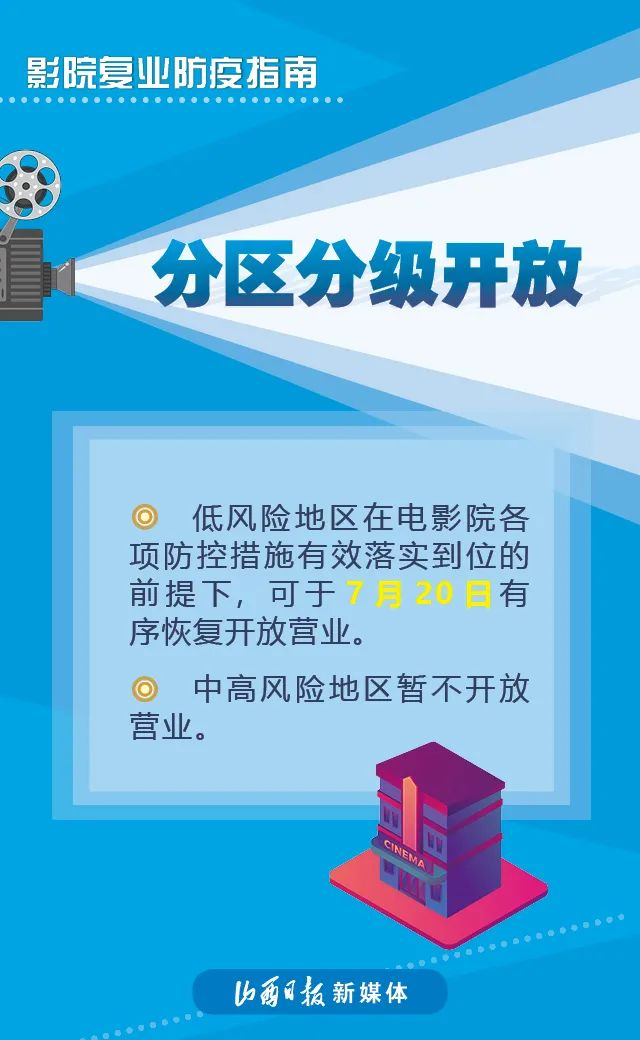 近日,國家電影局發(fā)布《關(guān)于在疫情防控常態(tài)化條件下有序推進(jìn)電影院恢復(fù)開放的通知》稱,低風(fēng)險地區(qū)在電影院各項(xiàng)防控措施有效落實(shí)到位的前提下,可于7月20日有序恢復(fù)開放營業(yè)。具體要求如下↓↓↓
