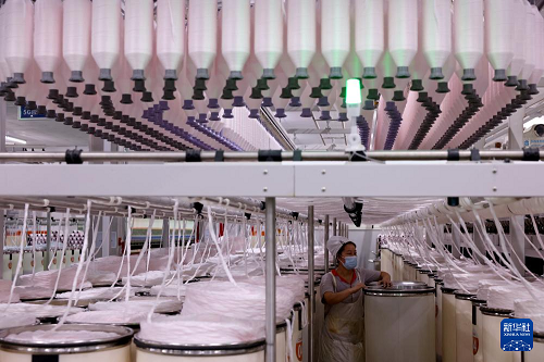 12月16日, 工人在山東棗莊經(jīng)濟開發(fā)區(qū)一家企業(yè)的智能化生產線上加工高端紗線。(新華社發(fā) 孫中喆 攝)