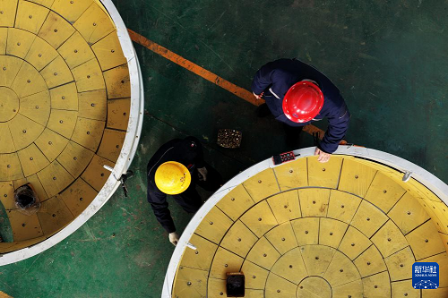 12月16日,在山東青島中青林集團有限公司生產車間,工人在安裝攪拌機襯板(無人機照片)。(新華社發(fā) 王海濱 攝)