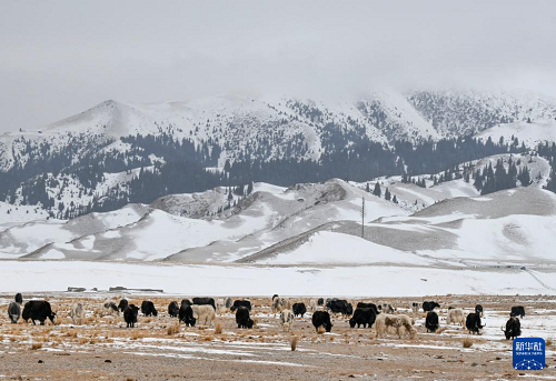 牛群在賽里木湖邊吃草(12月15日攝)。(新華社記者 王菲 攝)