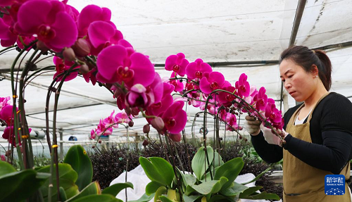 12月23日,甘肅省定西市臨洮縣一花卉種植基地的工人在管護(hù)蝴蝶蘭。(新華社發(fā) 王克賢 攝)