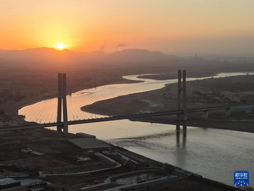 12月23日在日出時(shí)分拍攝的包銀高鐵烏海黃河特大橋。(新華社記者 邢廣利 攝)