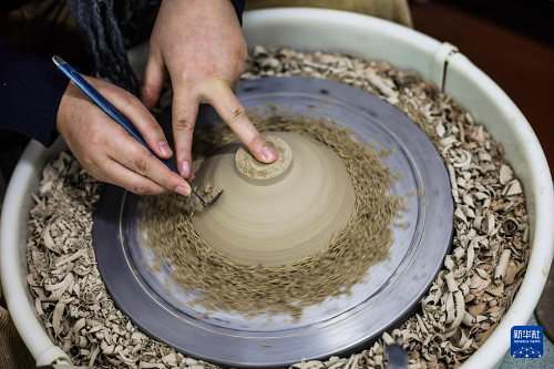 12月24日,侯夢(mèng)露在位于匡堰鎮(zhèn)倡隆村的楝樹下藝術(shù)村落的東岙窯陶瓷藝術(shù)工作室內(nèi)進(jìn)行青瓷制作流程中的修坯。(新華社記者 徐昱 攝)