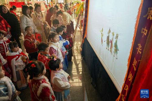 12月30日,四川省眉山市彭山區(qū)學院路幼兒園小朋友在區(qū)文化館新春非遺市集活動上觀看非遺皮影戲。(新華社發(fā) 翁光建 攝)