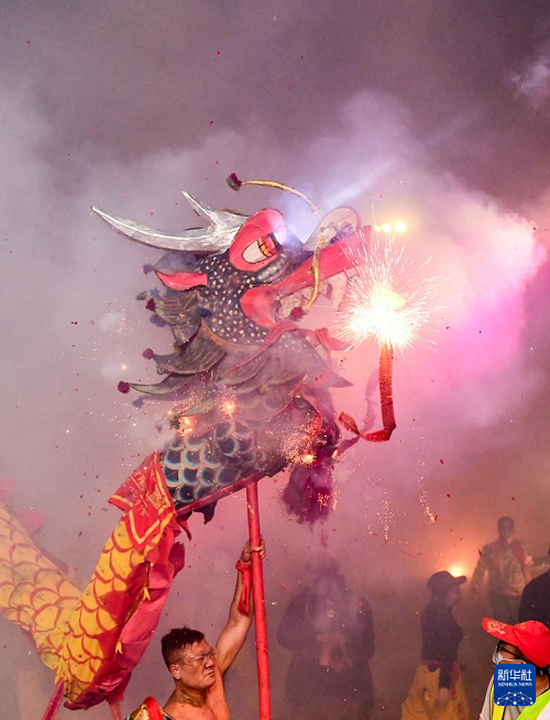 2月27日,在廣西賓陽(yáng)縣炮龍文化廣場(chǎng),人們?cè)谂邶埞?jié)上舞炮龍。(新華社記者 陸波岸 攝)