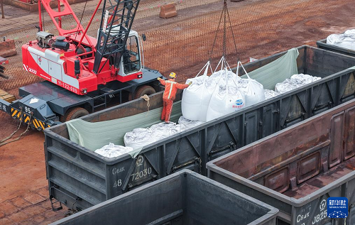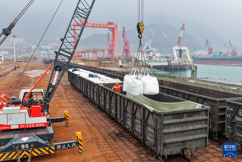 3月4日,工人在江蘇連云港港東方港務(wù)分公司碼頭鐵路裝車點將化肥裝上貨運專列(無人機(jī)照片)。(新華社發(fā) 王健民 攝)