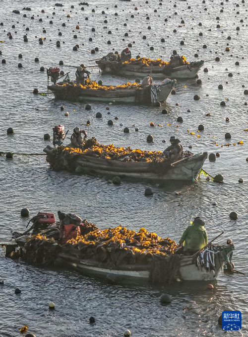 眼下,在我國海帶主產(chǎn)區(qū)山東省榮成市,海洋牧場海帶養(yǎng)殖區(qū)一派繁忙景象。養(yǎng)殖戶對近岸養(yǎng)殖區(qū)達到成熟標準的海帶分批收割,為后期收割的海帶留出生長空間,以便提高海帶產(chǎn)量和質(zhì)量。