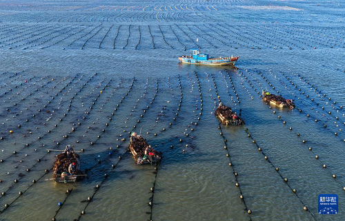 3月9日,在山東省榮成市愛倫灣海洋牧場海帶養(yǎng)殖區(qū),養(yǎng)殖工人收獲海帶(無人機照片)。(新華社發(fā) 王福東 攝)