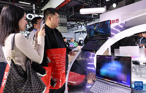 3月12日,參觀(guān)者在東方樞紐展區(qū)現(xiàn)場(chǎng)一款屏幕可伸縮的筆記本電腦產(chǎn)品前駐足觀(guān)看。(新華社記者 方喆 攝)