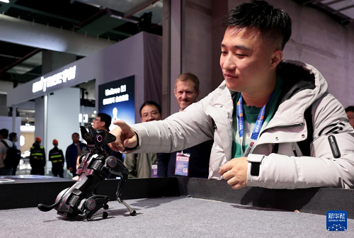 3月12日,參觀(guān)者在東方樞紐展區(qū)現(xiàn)場(chǎng)與一個(gè)名叫“哮天Sirius”的公斤級(jí)可訓(xùn)練機(jī)器狗互動(dòng)。(新華社記者 方喆 攝)
