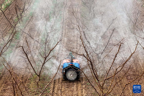 3月19日,山西省運城市平陸縣張村鎮(zhèn)的農(nóng)民為果樹噴灑農(nóng)藥(無人機照片)。(新華社記者 曹陽 攝)