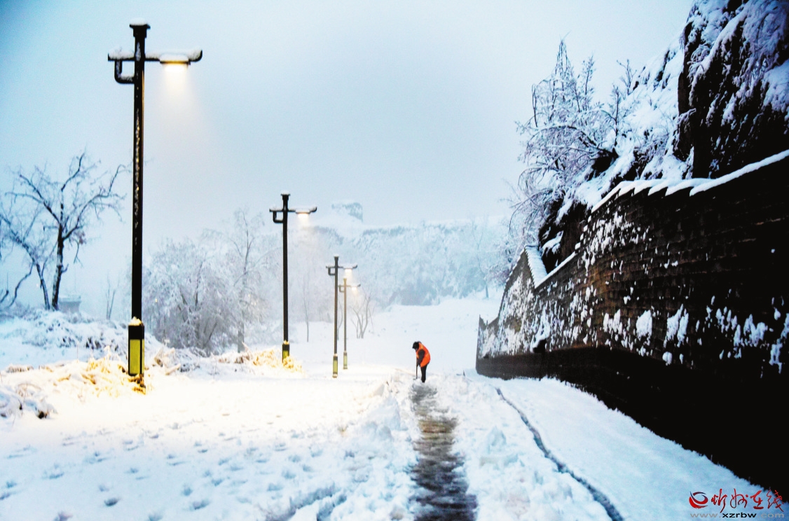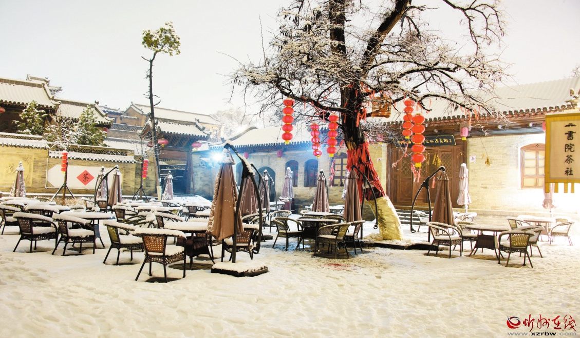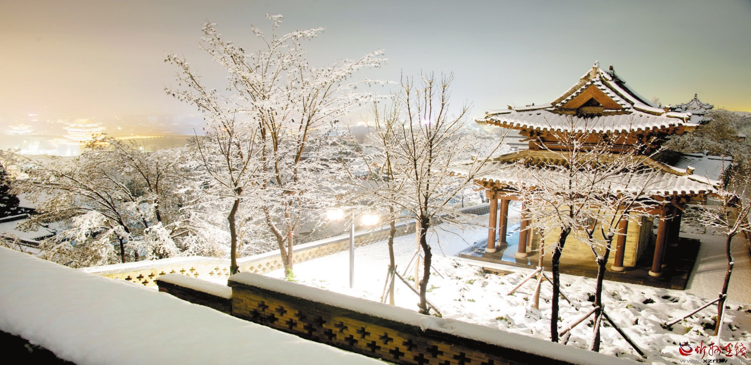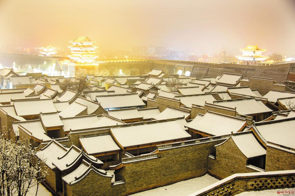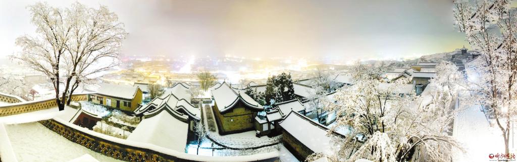 3月19日,我市普降瑞雪,雪后的忻州古城銀裝素裹,古建民居和燈火璀璨的夜景相互輝映,宛如畫卷。(趙晨善 攝)