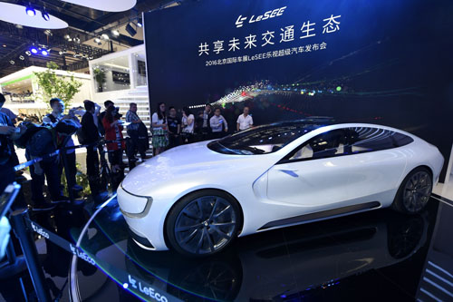 4月25日,觀眾在參觀車展展出的樂視電動汽車。當日,2016(第十四屆)北京國際汽車展覽會在京開幕。新華社記者鞠煥宗攝