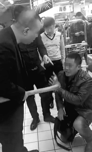 昨天,一段視頻在網(wǎng)上被熱議。“再不松開(kāi)把你腿削折了”,一棕色外套男子被逼跪在地上,抱著收銀臺(tái)附近的欄桿連連承諾“再不來(lái)了”。另外兩個(gè)大漢在旁拖拽他,其中一人用木棒打向男子,另一人在旁邊踢了該男子一腳,并威脅道:“再來(lái)讓你沒(méi)命”(如圖)。
