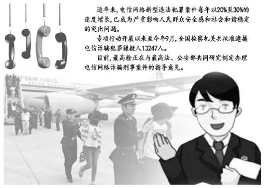 《法制日報》記者從最高人民檢察院與公安部近日聯(lián)合召開的電信網(wǎng)絡新型違法犯罪重點整治、突出地區(qū)督導會上了解到,被掛牌的7個重點地區(qū)和5個突出地區(qū)檢察機關積極主動作為,出重拳、下重手、用重典,快速批捕起訴了一批有震動、有影響的重大電信網(wǎng)絡詐騙犯罪案件,取得了初步成效。據(jù)統(tǒng)計,專項行動開展以來至今年9月,全國檢察機關共批準逮捕電信詐騙犯罪嫌疑人13247人。