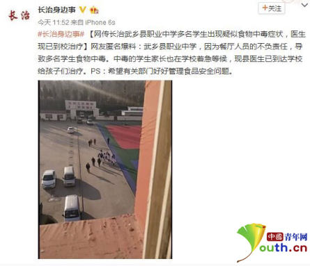 中國青年網(wǎng)記者就此事向武鄉(xiāng)縣職業(yè)中學(xué)進(jìn)行求證,該校辦公室劉老師稱,目前有二十余位同學(xué)在縣人民醫(yī)院住院治療。事情發(fā)生后學(xué)校領(lǐng)導(dǎo)高度重視,縣領(lǐng)導(dǎo)和教育局領(lǐng)導(dǎo)也都前往醫(yī)院看望生病學(xué)生。