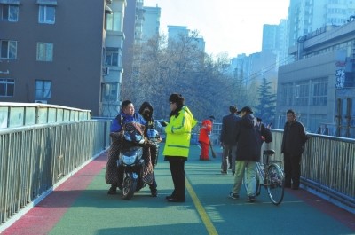 京華時報訊(記者張思佳)昨天,朝陽呼家樓交通大隊的交警在雙井橋北一過街天橋上,對在天橋上騎行電動車者進行處罰,騎行者當場被罰款20元。這是交管部門首次對電動車騎行橫穿過街天橋進行處罰。