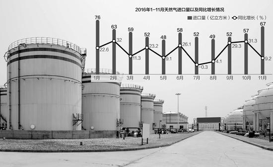 數(shù)據(jù)顯示,2016年1~11月天然氣進(jìn)口量4798萬(wàn)噸,同比增長(zhǎng)21.6%,天然氣進(jìn)口量占產(chǎn)量與進(jìn)口量之和的比重已達(dá)到34.9%,比去年同期提高了3.8個(gè)百分點(diǎn)。