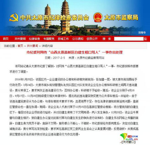 2月5日太原市紀(jì)委官方網(wǎng)站發(fā)布《市紀(jì)委對網(wǎng)傳“山西太原高新區(qū)白建生粗口罵人”一事作出處理》。