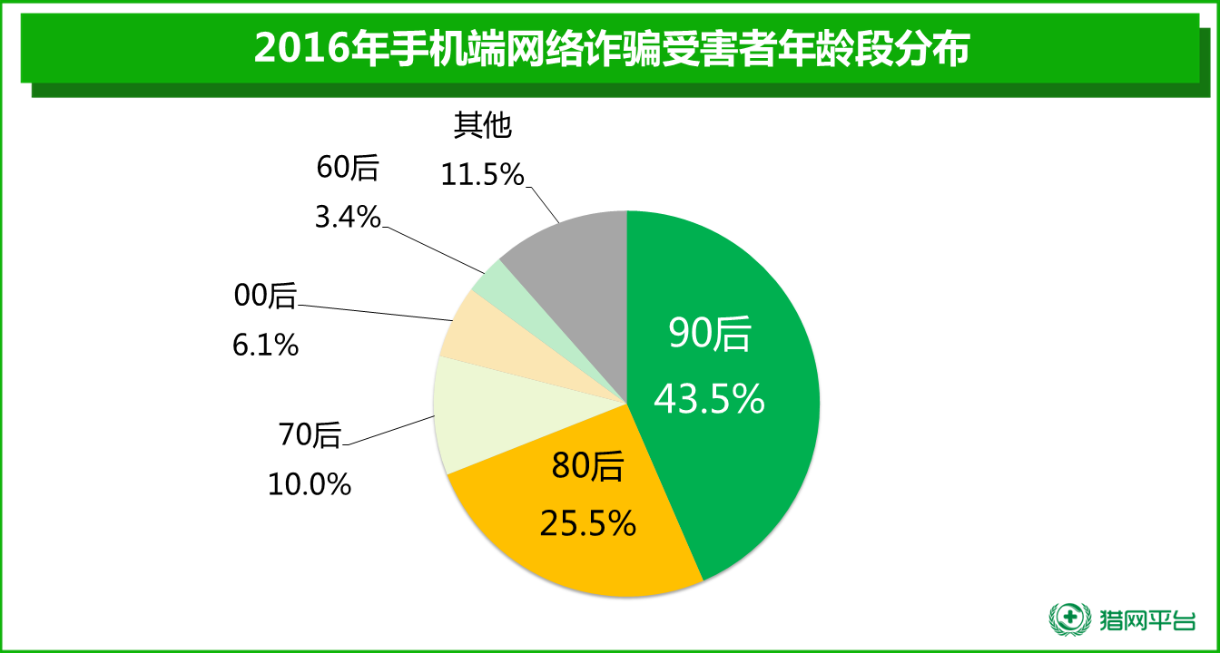 從被騙網(wǎng)民的年齡結(jié)構(gòu)上看,90后受網(wǎng)絡(luò)詐騙的比例最高,占受害者總數(shù)的43.5%,其次是80后占比25.5%,70后占比10.0%。