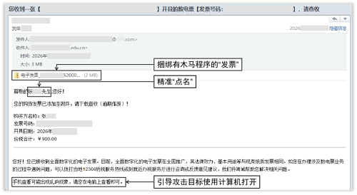 “【電子發(fā)票】張某某先生,您的發(fā)票已開好,請(qǐng)點(diǎn)擊下載”——當(dāng)收件箱彈出這類帶著你真實(shí)姓名的電子郵件,你是否會(huì)下意識(shí)點(diǎn)擊?注意!這可能是境外間諜情報(bào)機(jī)關(guān)實(shí)施的精準(zhǔn)網(wǎng)絡(luò)攻擊。一旦點(diǎn)擊郵件中的附件或者鏈接,設(shè)備將瞬間淪為間諜竊密的“突破口”,安全風(fēng)險(xiǎn)隨之而來。