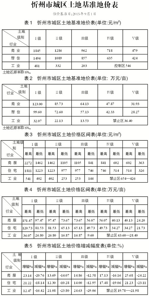 忻州市新一輪城鎮(zhèn)土地面積134.99平方公里基準地價更新工作已經(jīng)省國土資源廳組織有關(guān)專家檢查驗收。根據(jù)《山西省國土資源廳關(guān)于忻州市城鎮(zhèn)土地定級估價更新結(jié)果的批復》(晉國土資技審〔2015〕118號),現(xiàn)將忻州市城鎮(zhèn)土地基準地價予以公布實施。