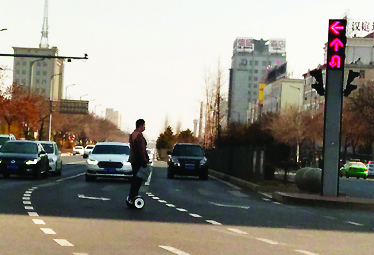 一男子騎助力車橫穿馬路,危險(xiǎn)?。ㄍ鯂鴹?攝)