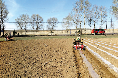 時下正值春耕春播時節(jié),我市各地的農(nóng)民忙著翻地、撒肥、鋪膜、犁土、播種,田野上拖拉機、播種機等農(nóng)機來回穿梭,一片繁忙景象。圖為4月21日五寨縣小河頭村村民正在鋪膜。(張志遠(yuǎn) 攝)