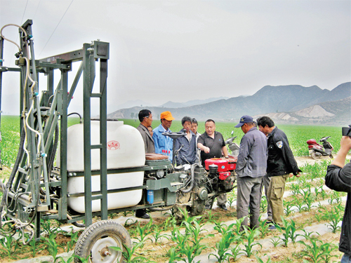 在五臺縣茹村鄉(xiāng)農機化示范區(qū),廠方技術員正在對農機具操作手進行技術培訓,該示范區(qū)推廣應用了中農(北京)豐茂植保機械有限公司生產的3WX—400G 型自走式高稈作物噴稈噴霧植保機械,提升了玉米生產機械化程度。(鄭素平 攝)