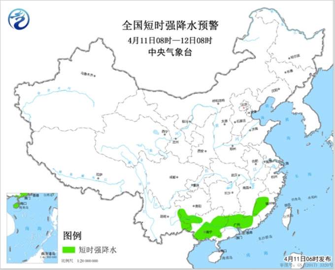 預(yù)計(jì)4月11日08時(shí)至12日08時(shí),貴州西南部、福建西南部、廣西西部和東部、廣東西北部等地的局地將有8-10級(jí)雷暴大風(fēng)或冰雹天氣;此外,貴州西南部、福建西部、廣西大部、廣東中北部等地的部分地區(qū)將有短時(shí)強(qiáng)降水天氣,小時(shí)雨強(qiáng)20-40毫米,局地可達(dá)50毫米以上。
