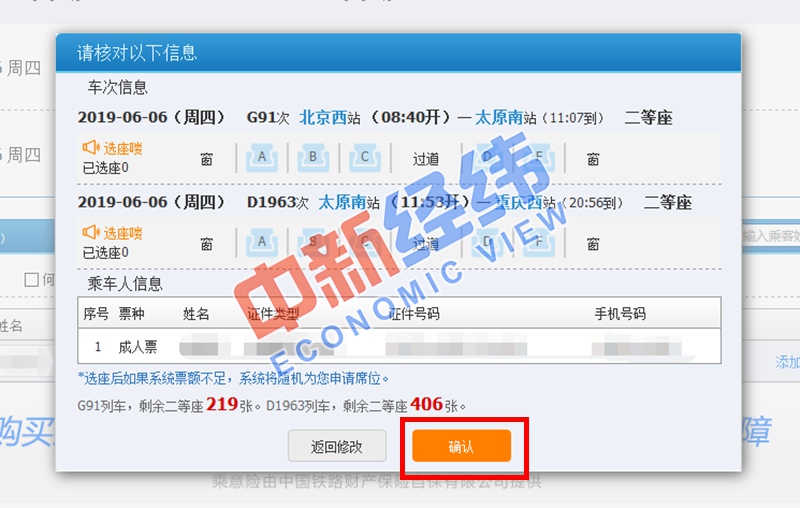 4、一切準(zhǔn)備就緒后,就可進(jìn)行車票預(yù)訂了。點(diǎn)擊“預(yù)訂”后,系統(tǒng)會(huì)再次對(duì)換乘信息進(jìn)行提示,確認(rèn)無誤后選擇對(duì)應(yīng)車次所需席別,添加乘車人信息。