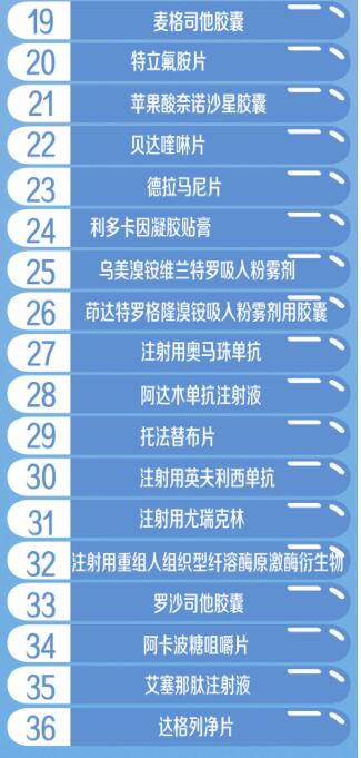 國家醫(yī)保局醫(yī)藥服務(wù)管理司司長熊先軍介紹,此次談判成功的藥品多為近年來新上市且具有較高臨床價(jià)值的藥品,涉及癌癥、罕見病、風(fēng)濕免疫、心腦血管、消化等10余個(gè)臨床治療領(lǐng)域。重點(diǎn)領(lǐng)域的5個(gè)基本藥物全部談判成功,22個(gè)抗癌藥、7個(gè)罕見病用藥、14個(gè)慢性?。ê悄虿?、乙肝、風(fēng)濕性關(guān)節(jié)炎等)用藥、4個(gè)兒童用藥談判成功,進(jìn)一步優(yōu)化了目錄結(jié)構(gòu)。