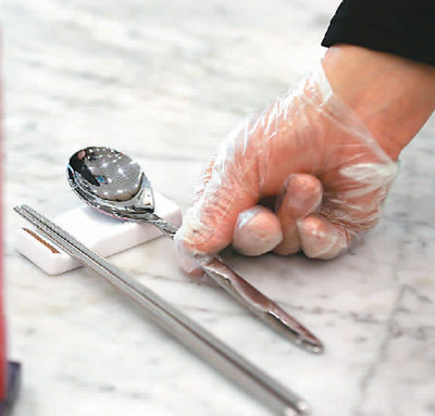 在北京市朝陽(yáng)大悅城一家餐飲店內(nèi),食客隔位而坐,餐具“公私”分明?!伴_始使用公筷、公勺時(shí),有點(diǎn)不習(xí)慣,不過(guò)現(xiàn)在已經(jīng)適應(yīng)了,分著吃更安全。”在店內(nèi)用餐的黃先生說(shuō)。