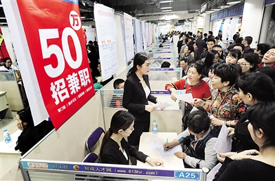 23日上午11點(diǎn),重慶市江北區(qū)觀音橋一家人才招聘市場(chǎng)內(nèi),一個(gè)掛著“五十萬(wàn)招兼職”海報(bào)的招聘展位前人頭攢動(dòng)。排隊(duì)等候填表報(bào)名的人將兩米寬的過道塞得滿滿當(dāng)當(dāng)。