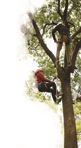 4月26日,蘇州市盤門景區(qū)里的一幕吸引了不少游客。景區(qū)香樟林里的一片區(qū)域,被隔離帶隔開(kāi),里面有兩棵比較粗壯的香樟樹(shù),樹(shù)干上垂著多條繩索。12名全副武裝的學(xué)員,戴著安全頭盔、系著安全繩、穿著安全靴,在總教練的指導(dǎo)下,握著繩索開(kāi)始往樹(shù)上攀爬。