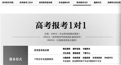 北青報記者發(fā)現(xiàn),面對考生家長對于志愿填報的“迫切需求”,目前高考志愿填報咨詢的價格都在幾千元到幾萬元不等。這位潘姓工作人員表示,該機構(gòu)設(shè)有線上、線下志愿填報兩套方案,其中線上填報方案價格為3980元,志愿填報咨詢老師與學生并不見面,而是通過QQ、郵件等方式為學生和家長出具志愿填報方案。而線下志愿填報方案為1對1有針對性的填報,但是根據(jù)咨詢經(jīng)驗的多寡收費也不相同。“比如我們有七八年行業(yè)經(jīng)驗的呂老師收費是22800元,有6年經(jīng)驗的郭老師收費是20800元,要是有3年經(jīng)驗的李老師收費則為16800元?!贝送?,一家名為融聚未來的機構(gòu)的高姓負責人也向記者介紹,該機構(gòu)高考志愿填報1對1服務(wù)的價格在8000元到2萬元以內(nèi)。最讓人吃驚的是,一家名為贏鼎教育的高考報考機構(gòu),在官網(wǎng)上明示的高考報考1對1項目中明確標價,專業(yè)咨詢師提供服務(wù)的收費4980元,高考報考學創(chuàng)始團隊提供指導的收費為19800元,王海濤老師親自服務(wù)的標價為98000元。
