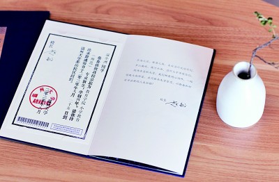 在溫州大學(xué)本科招生錄取現(xiàn)場,一本本藍(lán)色燙金的錄取通知書正整整齊齊地?cái)[放在會議桌上,整裝待發(fā)。通知書整體采用中國傳統(tǒng)文書褶子樣式,封面是燙金的“錄取通知書”和學(xué)校校徽,封底是王蒙題詞的校訓(xùn)“求學(xué)問是,敢為人先”。展開五折折頁,正面分別是瑞安市東源村木活字傳承人親手印刷的錄取證書頁、校長寄語、校歌,背面則是以溫州地理標(biāo)志大羅山為底、溫大建筑為前景的山水畫卷。