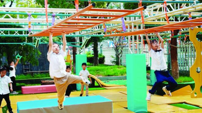 常州市五星幼兒園的負責(zé)人王艷表示,有一次同事將幾條外國幼兒園、小學(xué)低年級年齡段孩子進行體能訓(xùn)練的視頻發(fā)了過來,視頻上的孩子能夠完成跳鞍馬、手倒立行走等動作?!坝谑牵覀兘Y(jié)合孩子們的意見,邀請專家共同繪制賽道構(gòu)思圖,將平衡、走、跑、跳、攀爬、懸掛等動作元素融為一體,打造出一個綜合性的體能游戲賽道?!?/p>