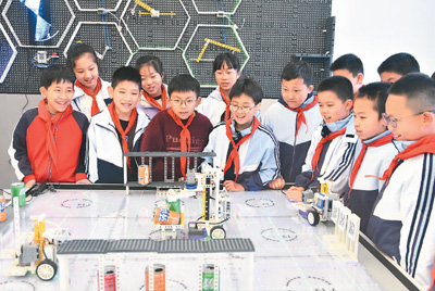 圖為江蘇省無錫市太湖格致中學以校園定點引導型機器人為主題,開展人工智能課堂教學。顧曉驊攝