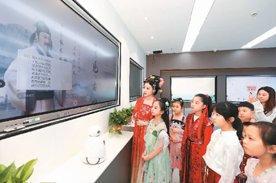7月19日,在安徽省淮北市圖書館AI智能廳,孩子們正在與“詩仙李白”進行互動。李 鑫攝(人民視覺)