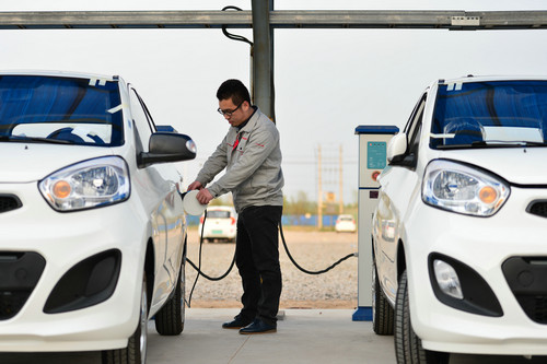 資料圖片:4月13日,河北省清河縣一家新能源汽車公司的工人在為新生產(chǎn)的電動(dòng)汽車充電。新華社發(fā)