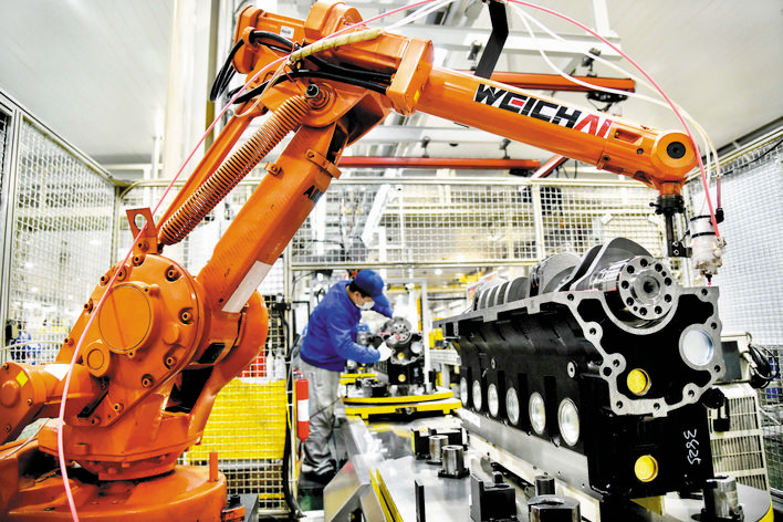 在位于山東濰坊的濰柴集團(tuán)一號(hào)工廠總裝車間,工人們?cè)诹魉€上裝配發(fā)動(dòng)機(jī)(3月19日攝)。 3月31日,國家統(tǒng)計(jì)局服務(wù)業(yè)調(diào)查中心、中國物流與采購聯(lián)合會(huì)發(fā)布數(shù)據(jù),3月份,中國制造業(yè)采購經(jīng)理指數(shù)(PMI)為52%,比上月回升16.3個(gè)百分點(diǎn)。