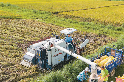 日前,江西省新余市渝水區(qū)羅坊鎮(zhèn)東邊村稻田內(nèi),農(nóng)民駕駛農(nóng)機(jī)搶收早稻。趙春亮攝(人民視覺(jué))
