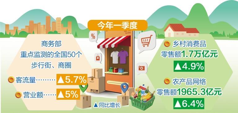 城市商業(yè)增速穩(wěn)定,一季度商務(wù)部重點(diǎn)監(jiān)測(cè)的全國(guó)50個(gè)步行街、商圈客流量、營(yíng)業(yè)額同比分別增長(zhǎng)5.7%、5%??h域消費(fèi)市場(chǎng)持續(xù)升溫,鄉(xiāng)村消費(fèi)品零售額1.7萬(wàn)億元,同比增長(zhǎng)4.9%,增速高于城鎮(zhèn)0.4個(gè)百分點(diǎn)。農(nóng)村電商蓬勃發(fā)展,全國(guó)農(nóng)村網(wǎng)絡(luò)零售額6697.5億元,同比增長(zhǎng)5.1%;農(nóng)產(chǎn)品網(wǎng)絡(luò)零售額1965.3億元,同比增長(zhǎng)6.4%。
