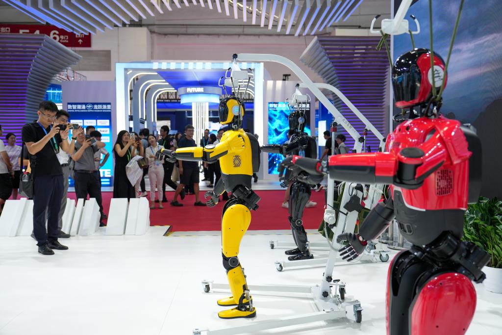 7月17日,在第三屆鏈博會數(shù)字科技鏈展區(qū),參觀者觀看人形機器人表演。新華社記者 鞠煥宗 攝
