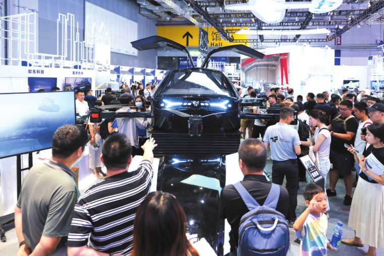 7月23日,觀眾在博覽會現(xiàn)場了解一款飛行汽車。
