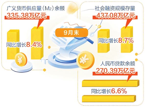 9月末,M2余額335.38萬億元,同比增長8.4%,在上年同期高基數背景下,仍保持較高增速;社會融資規(guī)模存量437.08萬億元,同比增長8.7%,比上年同期高0.7個百分點;前三季度,社會融資規(guī)模增量累計為30.09萬億元,同比多增4.42萬億元。