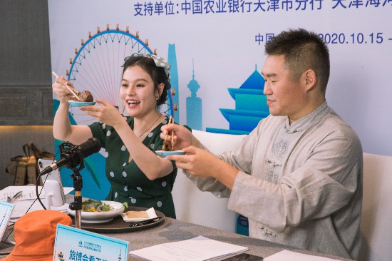 10月16日,在2020中國旅游產(chǎn)業(yè)博覽會上,主播通過直播推介美食。新華社發(fā)